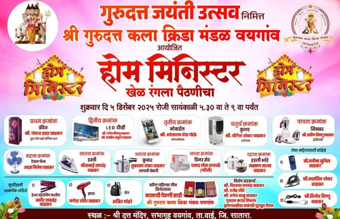 वाई (Wai News) तालुक्यातील मौजे वयगांव गावामध्ये गुरुवारी (4 डिसेंबर 2025) दत्त मंदिरामध्ये मोठ्या उत्साहात दत्त जयंती सोहळा पार पडला. दत्त जयंतीनिमीत्त मोठ्या संख्येने वयगांवकरांनी हजेरी लावली होती. शिक्षण आणि रोजगाराच्या निमित्ताने गावाबाहेर असलेला तरूण दत्त जयंतीनिमित्त वयगांवमध्ये दाखल झाला. बुधवार, गुरुवार आणि शुक्रवार असे तीन दिवस प्रवचन, किर्तन आणि भजनाच्या तालावर दत्तभक्तांनी मनमुराद आनंद लुटत दत्तांचा सहवास प्रत्यक्ष अनुभवला. यंदा वयगांवमध्ये प्रथमच महिलांसाठी विशेष होम मिनिस्टर स्पर्धेचे आयोजन करण्यात आले आहे. श्री गुरुदत्त कला क्रीड मंडळ, वयगांव आयोजित होम मिनिस्टरचा कार्यक्रम शुक्रवारी (5 डिसेंबर 2025) सायंकाळी 5.30 ते 9.00 या दरम्यान दत्त मंदिरामध्ये पार पडणार आहे. मानाची पैठणी साडी ते फ्रीज, टीव्ही, मोबाईल अशा विविध बक्षिसांची लयलूट होम मिनिस्टरमध्ये करण्यात येणार आहे.